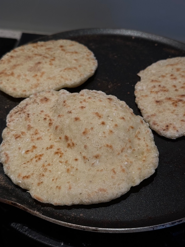 Vykynuté těsto rozdělte na 14 menších kousků. Každý trochu podsypejte moukou a vyválejte na placku. Smažte na suché pánvi z obou stran dozlatova – placky by se měly lehce nafukovat a tvořit bublinky.